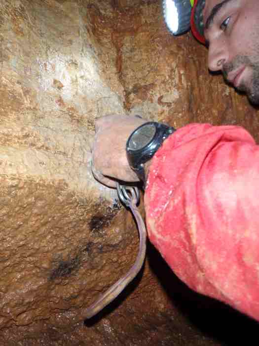 Procedeu-se à colocação de um spit na base do poço final para equipagem de um corrimão de acesso a este.