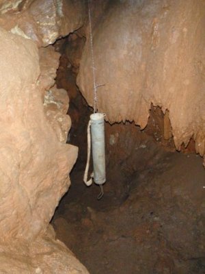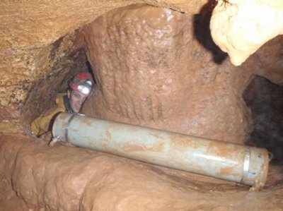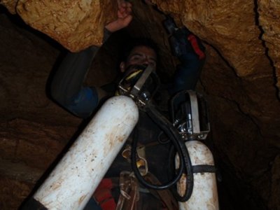 Tinha sido encontrada a continuação. A galeria submersa segue para Norte virando depois para Este, sendo que cerca de 12m depois do poço do mergulho fica a seco dando acesso a uma gateira. Ainda com muito ar nas garrafas o Rui decide fazer novo mergulho, desta vez na direcção Sul. E que mergulho foi! Desta vez aguardámos, já mais tranquilos, cerca de 15 minutos pelo regresso do espeleólogo e de mais novidades. Na direcção Sul a galeria (sempre submersa) vira para SE e tem uma secção já mais larga terminando algumas dezenas metros depois, mas não antes de dar acesso a 3 poços cuja profundidade se estima igual ou superior a 9 metros e que continuam ainda mais para o interior da zona activa.