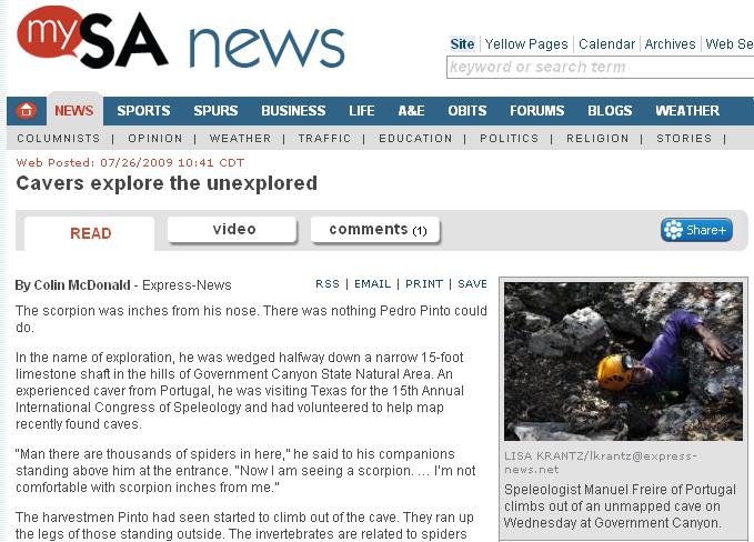 A equipa de espeleólogos Manuel Freire (NEUA), Pedro Pinto (CEAE-LPN) e Olivier Vidal (Vulcain-Lyon), foram acompanhados por um grupo de jornalistas numa saída de campo durante o último Congresso Internacional de Espeleologia, que decorreu no Texas em Julho de 2009.